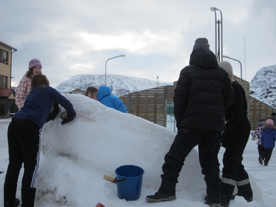 " Tirsdag var det igjen tid for snøskulpturer. Fredag ble kassene satt opp og fylt. Mens vi holdt på, kom det ei skikkelig rosse og tok to av kassene. Vi klarte å holde på to til Robin Jørgensen kom for å fylle de med snø. Tirsdag demonterte vi kassene og begynte å skulpturere. Vi hadde da på forhånd sett hvordan en virkelig kjent billedhugger, Skule Waksvik, jobber.